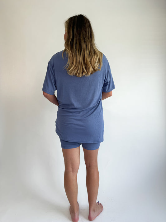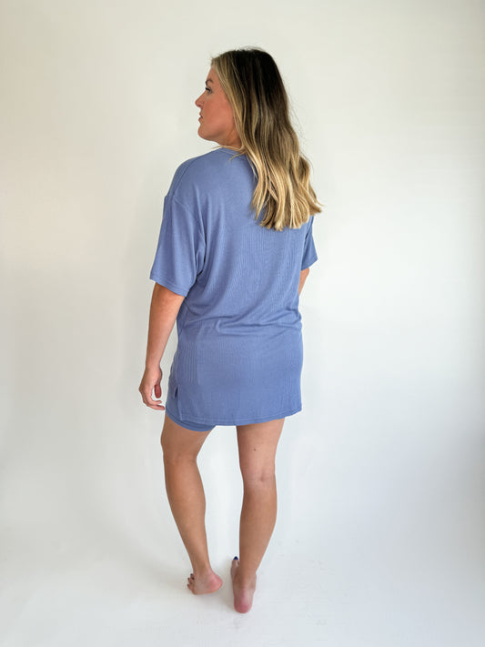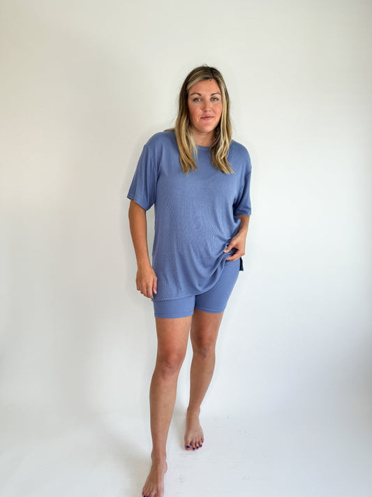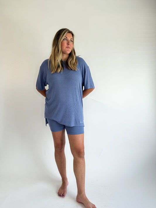 Oversized comfort, the softest ribbed material, & so much more in our Elemental Blue Ribbed Set. The biker shorts are not compressive, they are a lounge style! Top and bottom are sold together. We don’t recommend sizing up as this fits oversized and has tons of stretch. Haileigh is pictured wearing a Medium and is 5’8”, size 10/12 dress, and size 29/30 pants.