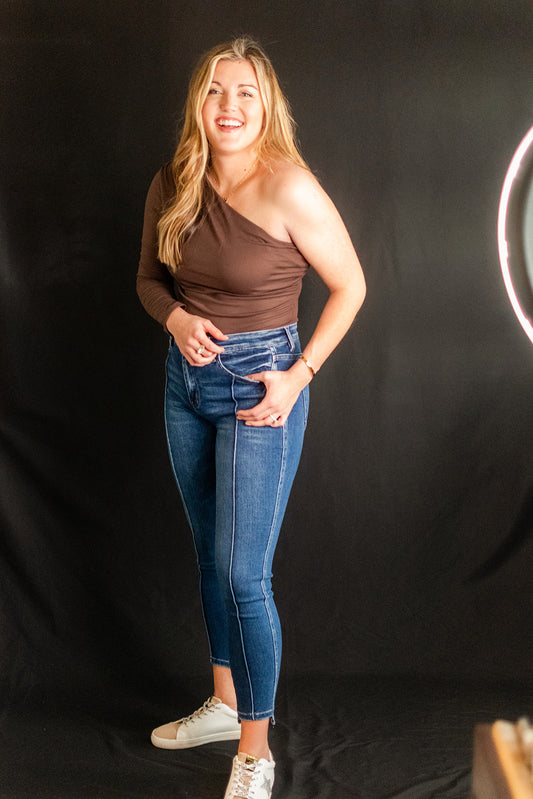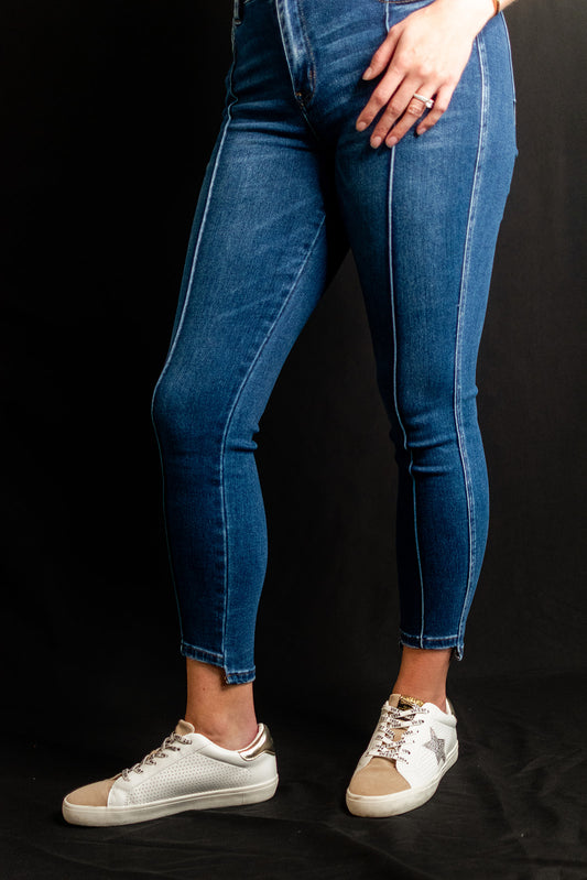 A classic jean that must be added to your staples. High rise, ankle length, front seam, and an uneven hem for a little extra detail. These jeans have HIGH STRETCH so we recommend going down if you are between sizes. Haileigh is wearing a size 28 and is usually a 29 or 30 depending on the stretch of the jeans. Haileigh is 5'8", size 30 pants, and size 10/12 dress.