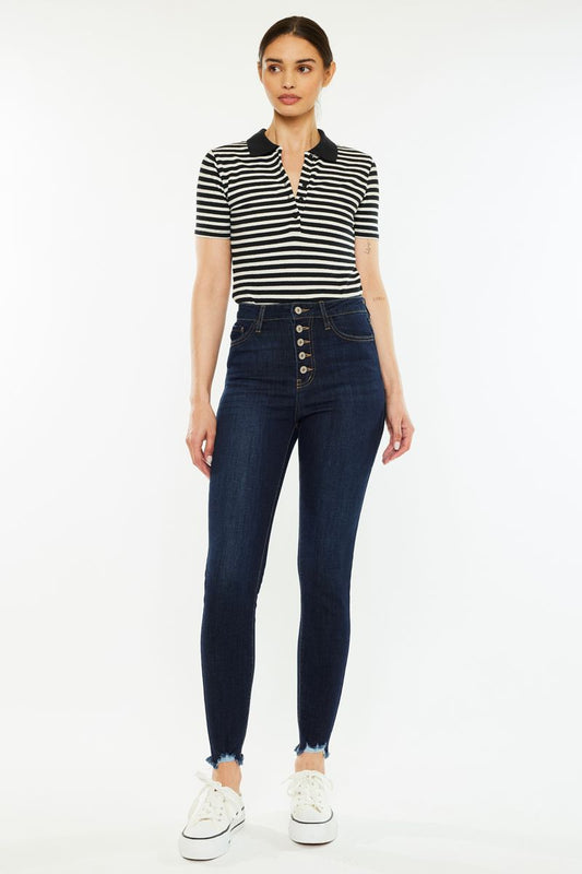 Lounge in style with our KanCan Button Fly Skinny jeans! Made with stretchy comfortable denim and a button fly, these jeans combine fashion and comfort. The slight distressed hem adds a touch of edge to your look. Perfect for any casual occasion. These jeans have stretch, so you can most likely go with your smaller size if you are between sizes!