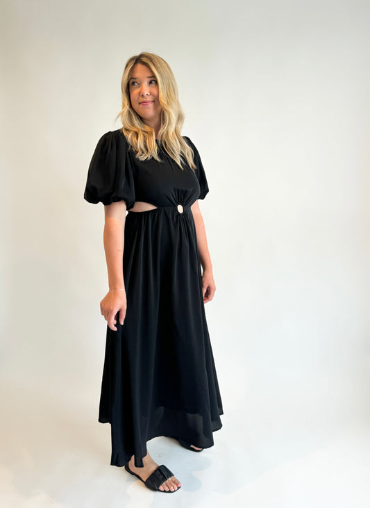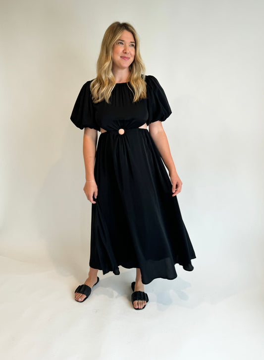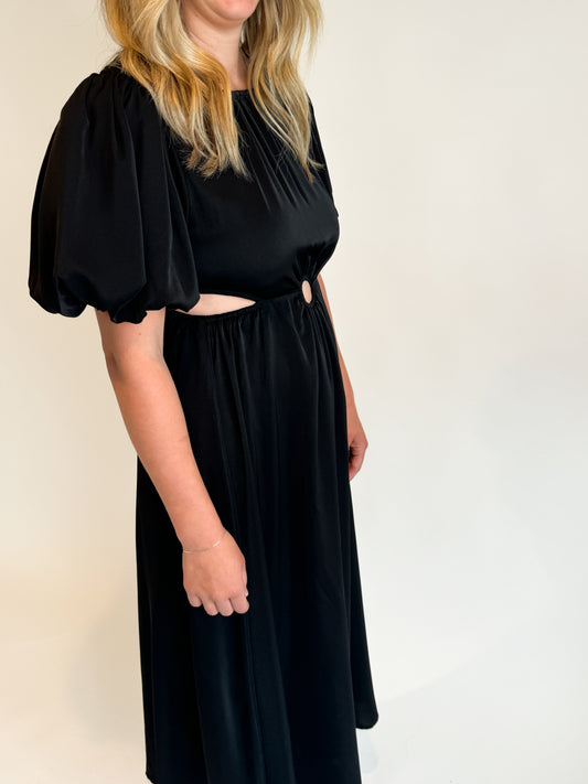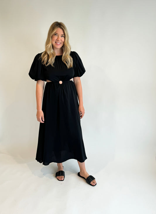 Unleash your playful side in the Jordan Midi dress. Puff sleeves, O ring, side cutouts, and a hidden back zipper make this dress effortlessly stylish. Lined and lightweight, it's perfect for any occasion. Morgan is wearing a Small and is 5'6" and size 4/6 in pants and dresses