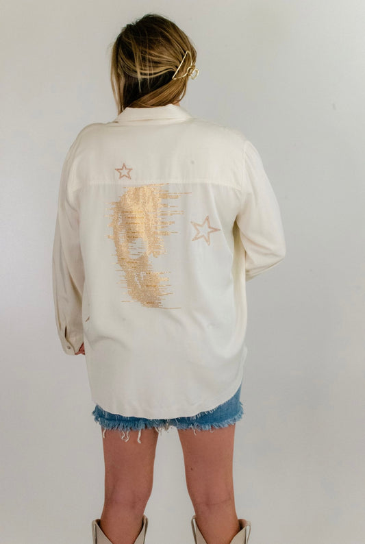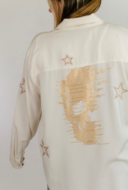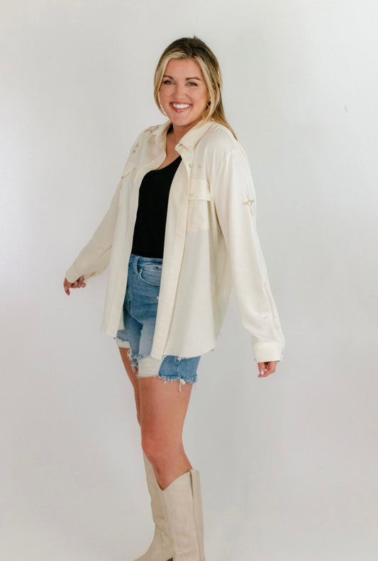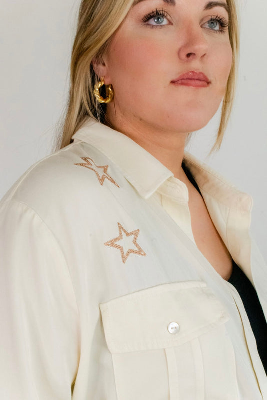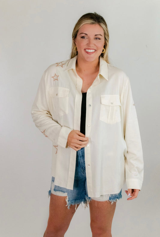 This Embroidered Jewel Shirt has it all - pearl iridescent buttons, a raw hem, and an ultra-soft Tencel fabric. The oversized fit provides a relaxed, comfortable feel with a touch of luxe. Perfect for everyday wear or special occasions. Haileigh is wearing a Large and is 5'8", size 10/12 Dress, and size 29/30 pants