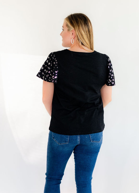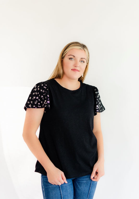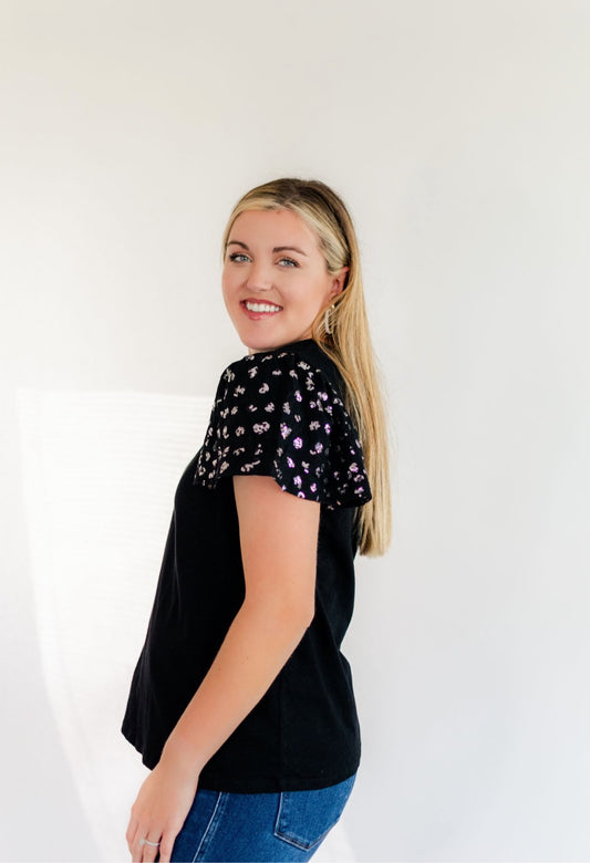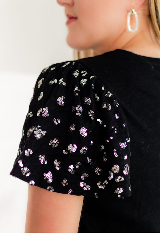 The Jungle Chic Tee is an effortlessly stylish top, crafted from luxurious cotton fabric with a relaxed fit. The garment features a patterned sequin design on the sleeves, making it ideal for the office or a night out. Haileigh is wearing a Medium and is 5'8", size 10/12 dress, and size 30 pants.