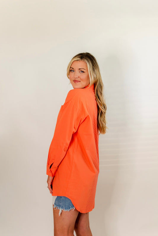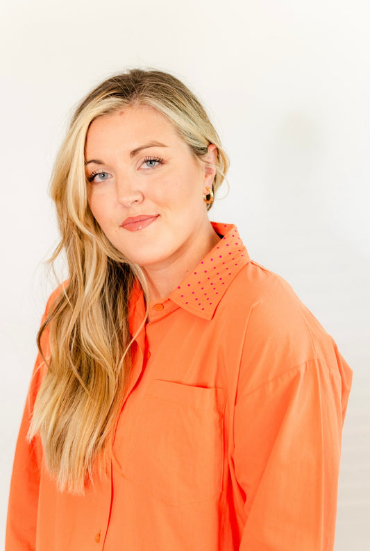 Stand out next time you walk in the room with this eye-catching Rhinestone Button Up. With a relaxed, roomy fit that is extra long, you'll be as comfortable as you are stylish. Plus, the custom hot pink rhinestones cascading down the back and on the collar will have you shining brighter than diamonds! Wear as a tunic, beach/pool coverup, and so much more!