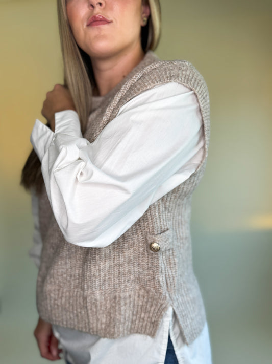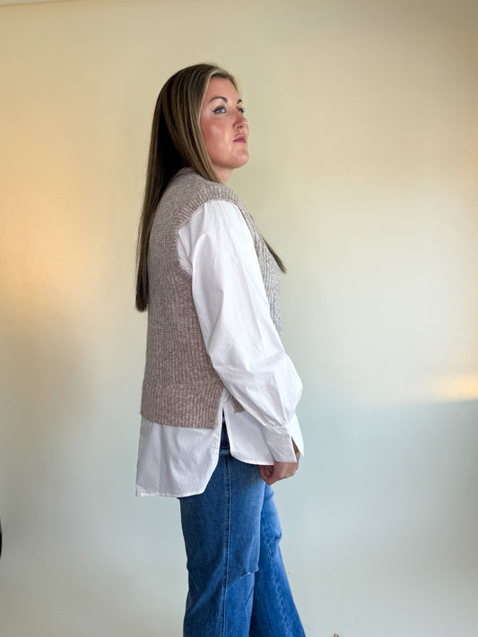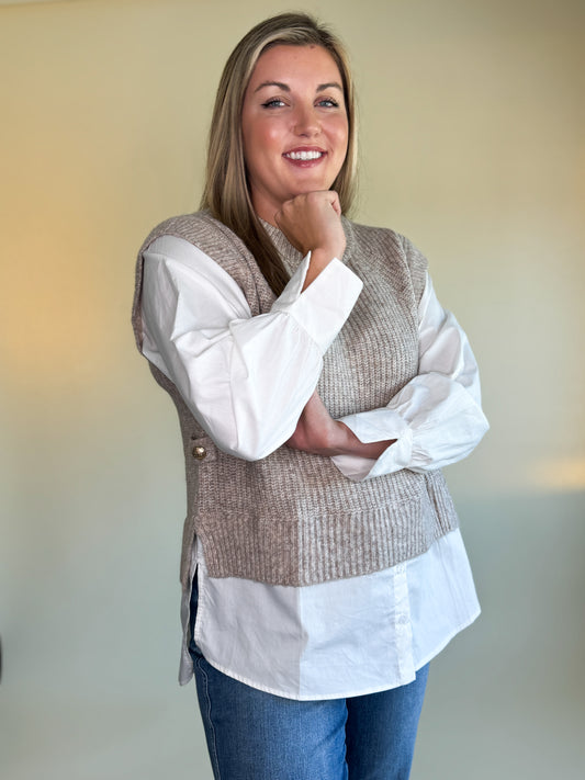 Get the perfect layered look without the uncomfortable bulk with our Lori Sweater Blouse! The soft knit provides ultimate comfort, while the crisp cotton underneath and gold button details add a touch of sophistication. Haileigh is wearing the M/L and is 5'8", size 10/12 dress, and size 29/30 pants