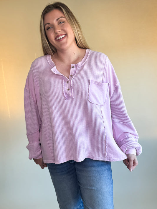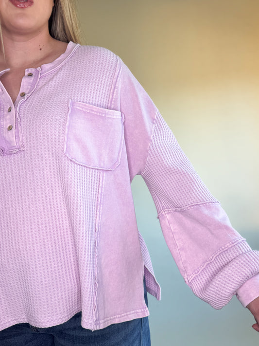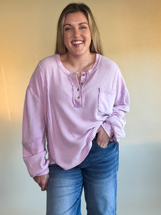 Show off your playful side with its fun washed henley and texture blocking detail. The long balloon sleeves add a touch of chic while the side slits offer a breezy, flattering fit. Haileigh is wearing a Large and is 5’8”, size 10/12 dress, and size 29/30 pants
