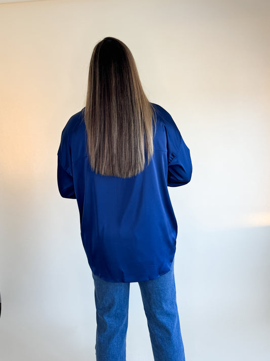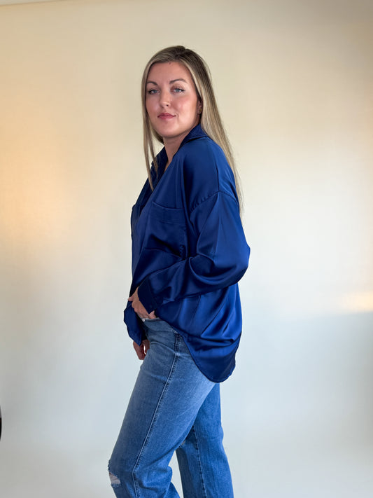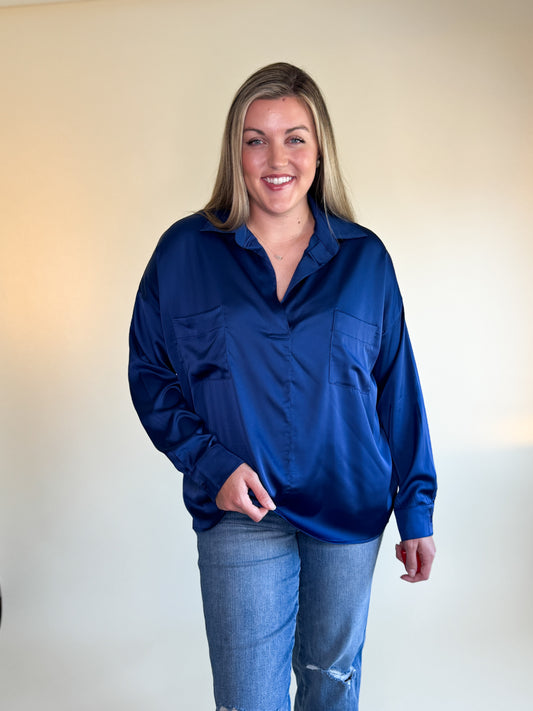 Experience ultimate comfort and effortless style with our Dani Satin Blouse. Featuring a luxurious tab collar and convenient pockets, it offers an oversized slouchy fit for a chic and relaxed look. Elevate your wardrobe with this versatile and elegant blouse. Haileigh wears a Medium and is 5'8", size 10/12 dress, and size 29/30 pants