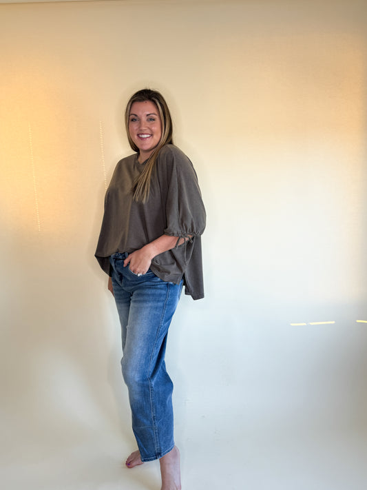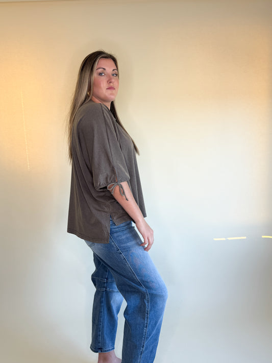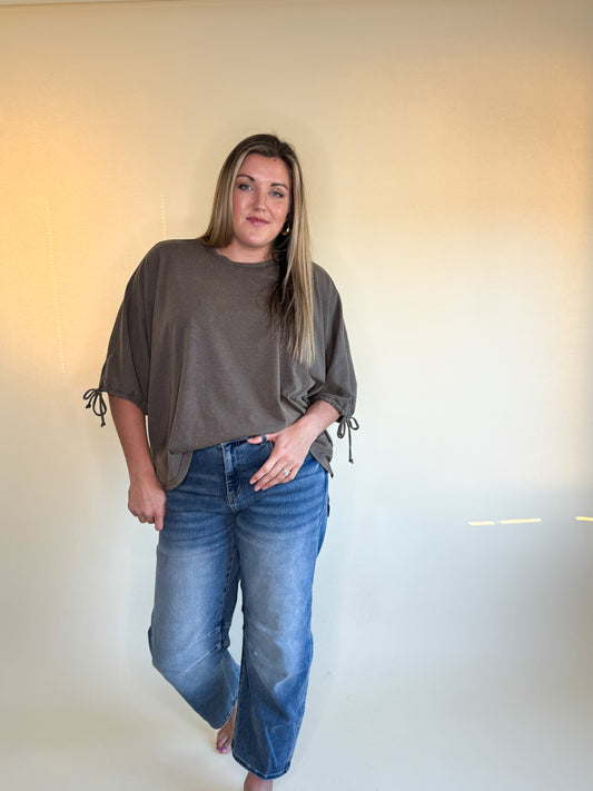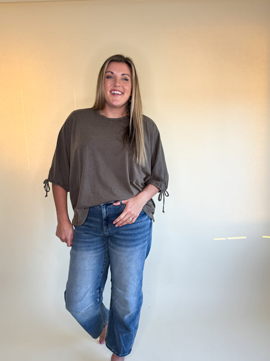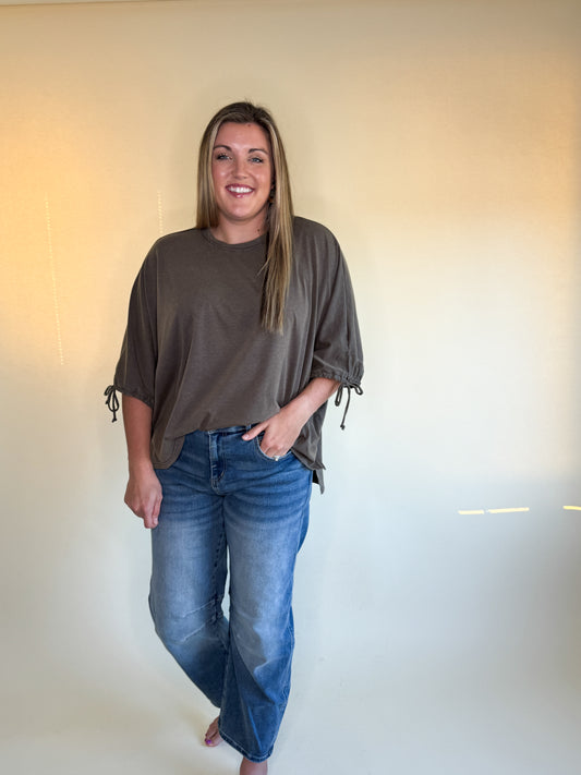 Feel confidently comfortable in our Molly Cinched Sleeve Top! Its relaxed and loose fit hugs your body in all the right places, while the adjustable cinched sleeves give you the perfect look and feel. Plus, the side slits add a touch of style to this top, making it a must-have addition to your wardrobe! Haileigh wears a Medium and is 5'8", size 10/12 dress, and size 29/30 pants