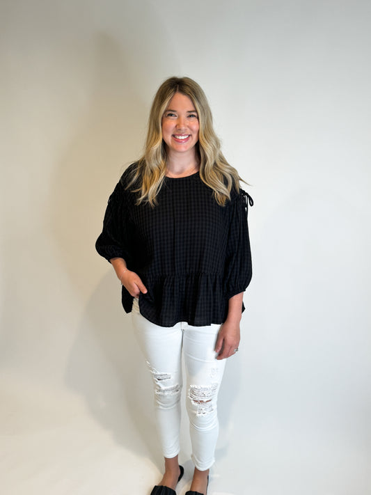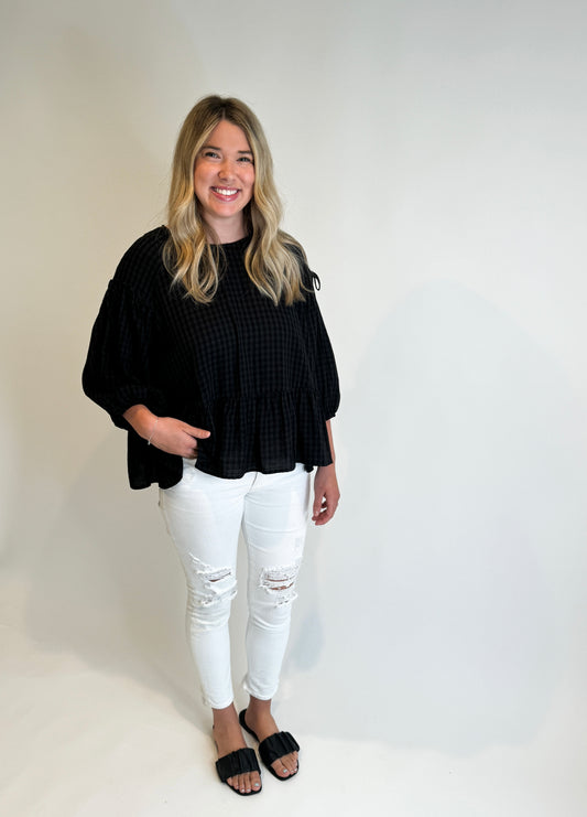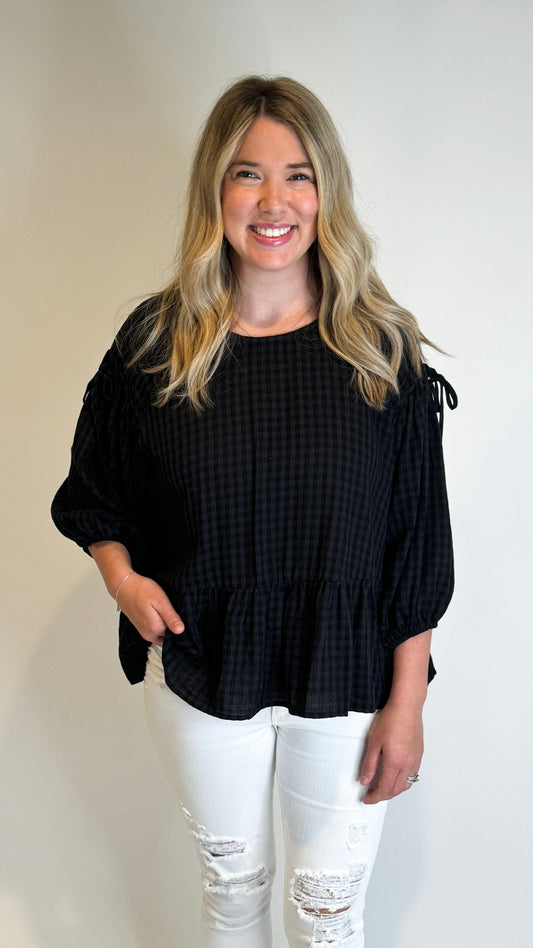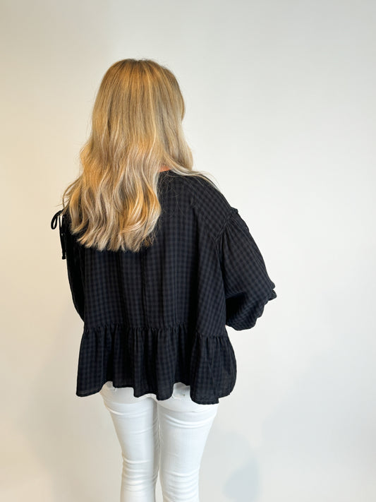Zoe's ruffled bottom and relaxed silhouette bring a playful twist to the classic gingham pattern and the ribbon string shirring on the sleeves adds a touch of whimsy. 50% Cotton, 50% Viscose. Morgan is wearing a Small and is 5'6" and size 4/6 in pants and dresses