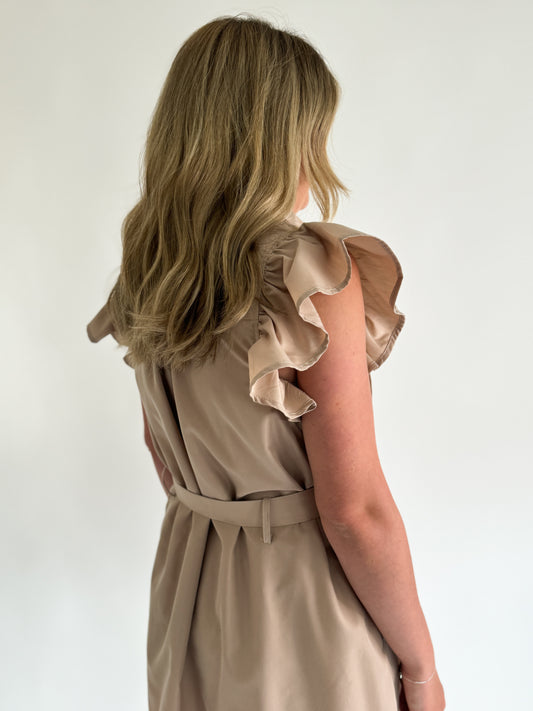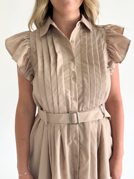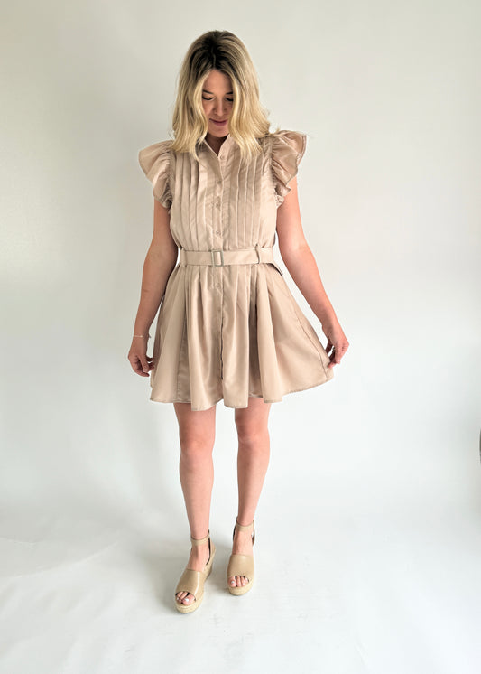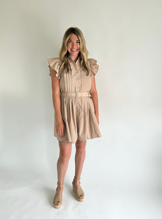 Embrace some whimsy with the Emery Belted Mini in Latte. This solid dress features pintuck detailing, a flattering belt, and convenient pockets. The ruffle sleeves add a playful touch, while the lightweight and lined fabric ensure comfort and ease. Morgan is wearing a Small and is 5'6" and size 4/6 in pants and dresses
