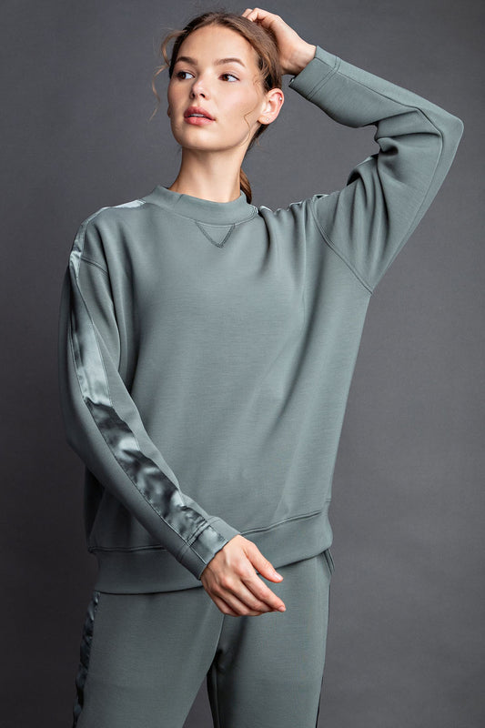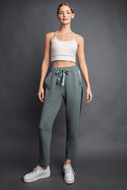 This straight leg jogger with satin detail is sure to wow the crowd, all while feeling as comfortable as if you're in your pajamas! Functional drawstring, pockets, & more. The model in the photos is 5'9" wearing a S. Haileigh is 5'8", size 10/12 dress, and size 29/30 jeans, and wears a L. Haileigh is 24 weeks pregnant and stuck with a Large. Modal, poly, spandex blend.